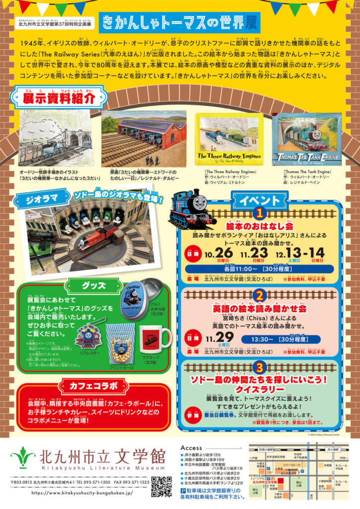 1945年、イギリスの牧師、ウィルバート・オードリーが、息子のクリストファーに即興で語りきかせた機関車の話をもとにした「The Railway Series(汽車のえほん)」が出版されました。この絵本から始まった物語は「きかんしゃトーマス」として世界中で愛され、今年で80周年を迎えます。本展では、絵本の原画や撮影に使用された模型など貴重な資料の展示のほか、デジタルコンテンツの参加型コーナーなどを設置します。「きかんしゃトーマス」の世界を存分にお楽しみください。